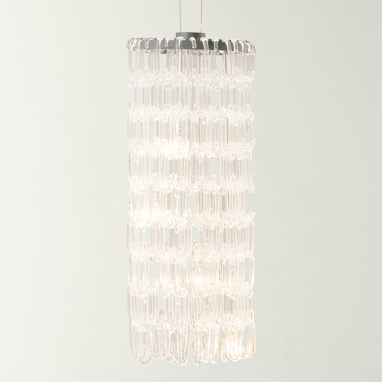 The C Chandelier is a 48 inch work of art! Made up of 396 hand blown clear C glass pieces that connect to each other like a chain. When lit the warm light radiates out making it a definite statement piece
