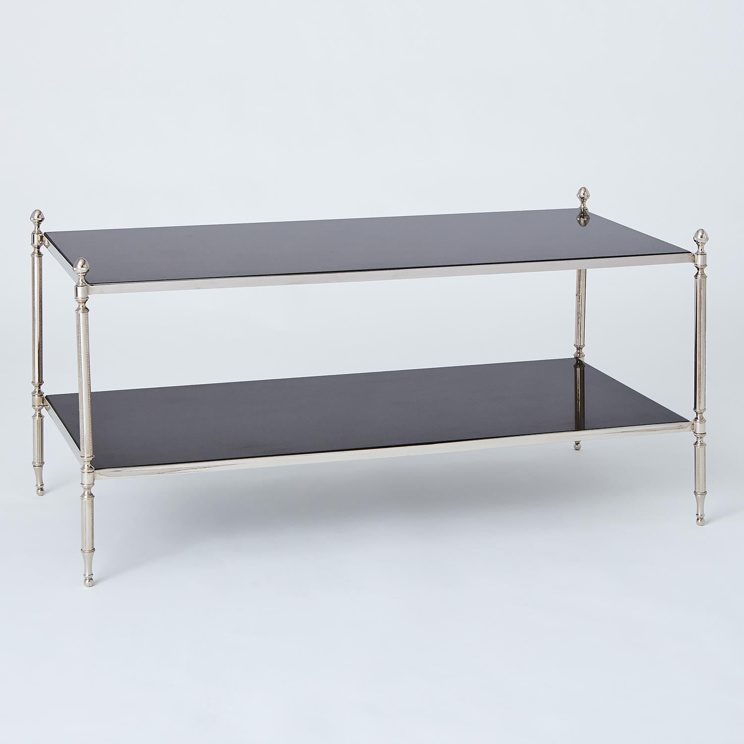 A two-tiered cocktail table with a black marble top for each tier and a nickel finished brass frame, this side table is perfect for both entertainment and storage.
