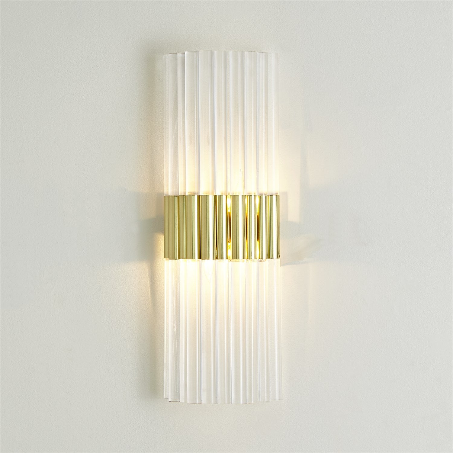Elegant in style, our Acrylic Sconce has varying heights of acrylic tubes held in place by a solid brass central 'belt'. Narrow in depth and completely hides the light bulbs.