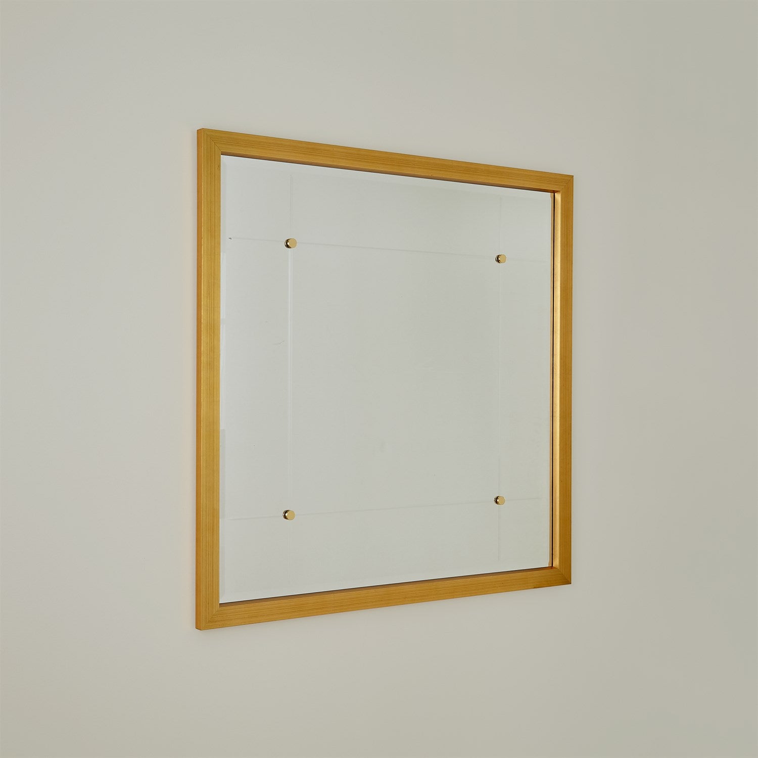Mirror frame is made of solid pine with gold leaf finish. Decorative beveled cut pattern on mirror with nickel clips. Available in two sizes.