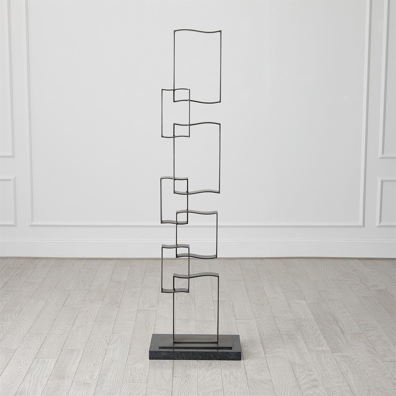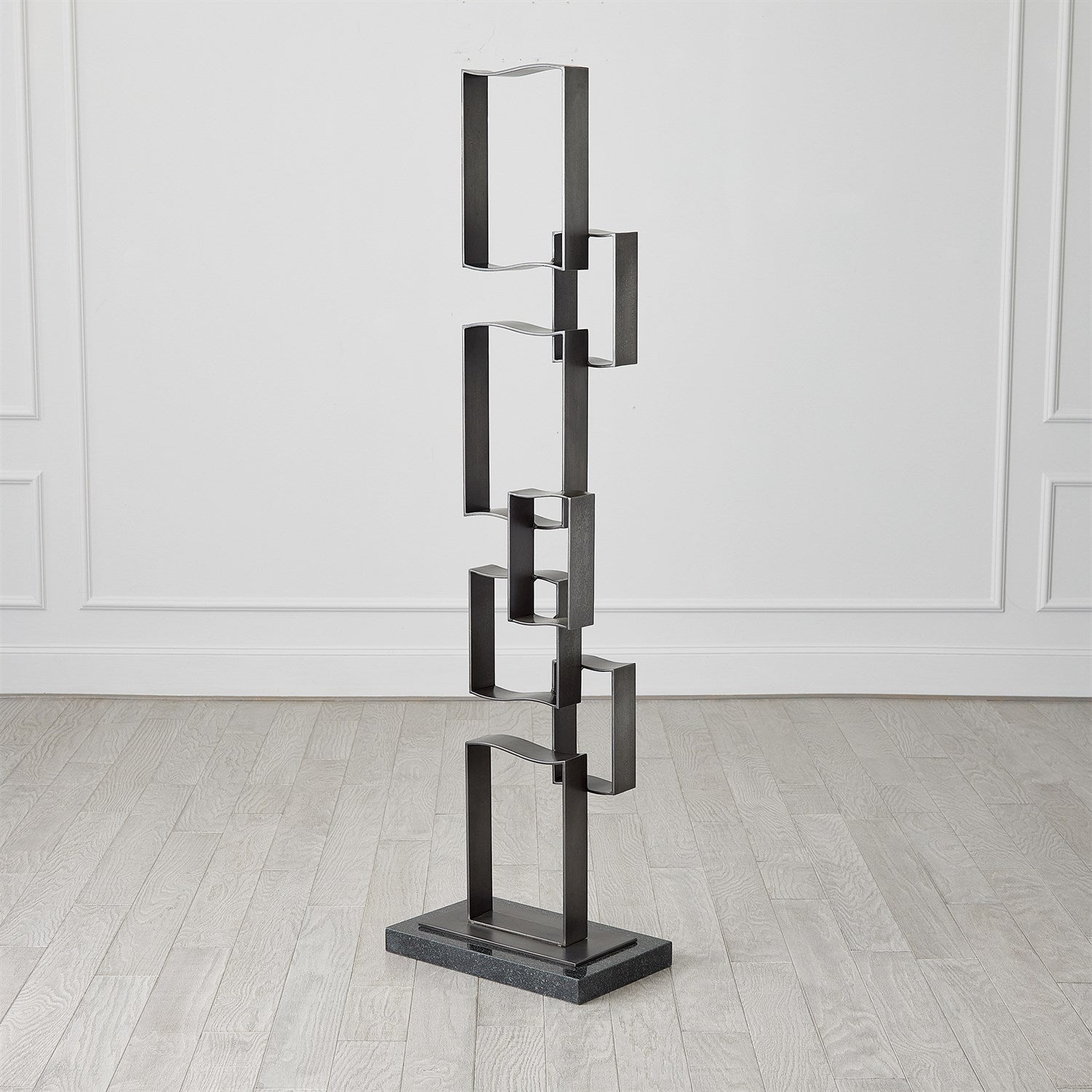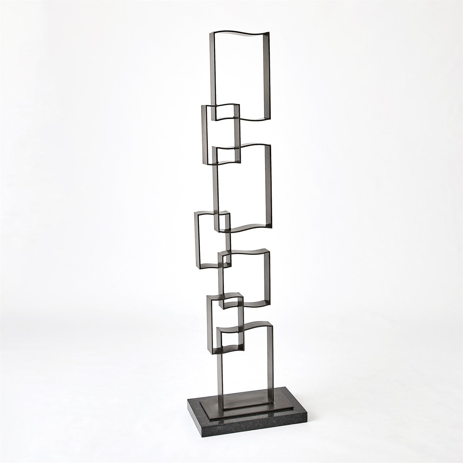 The Bent Square Sculpture is beautifully handcrafted from iron, showcasing a light gunmetal finish, and elegantly rests upon a black granite base.
