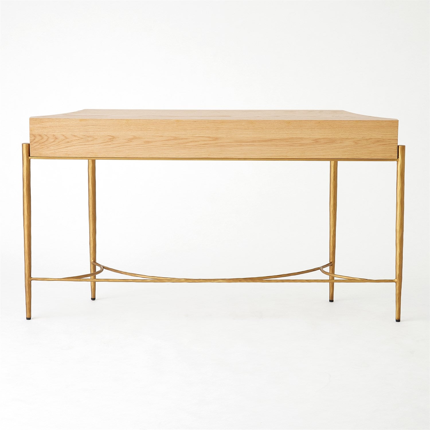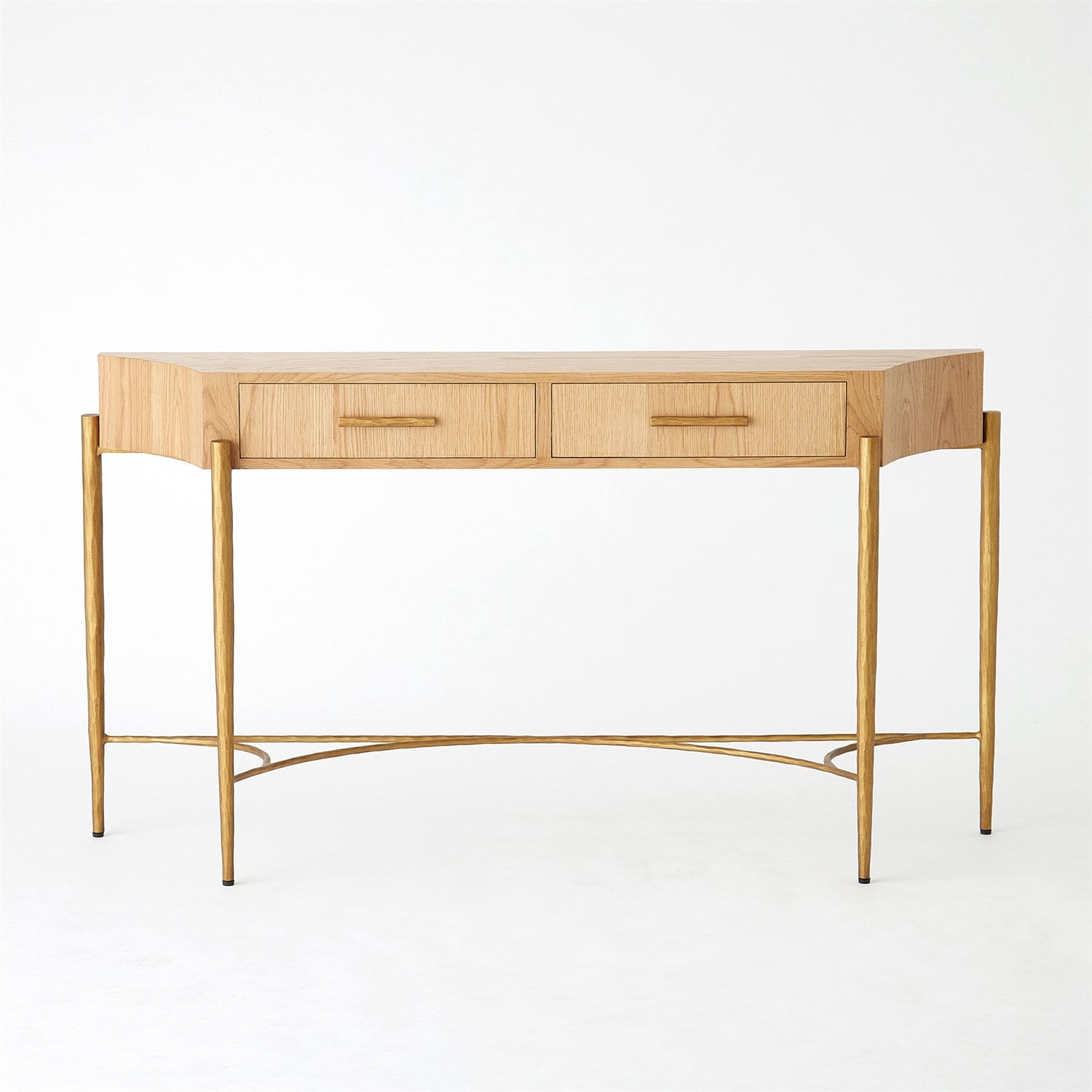 The Breakfront Console showcases a distinctive design where the center section "breaks" forward, creating a layered effect that adds visual interest and depth. Handcrafted from oak with a natural finish and featuring iron accents in an antique gold finish, this piece offers both style and functional display space for decorative items.
