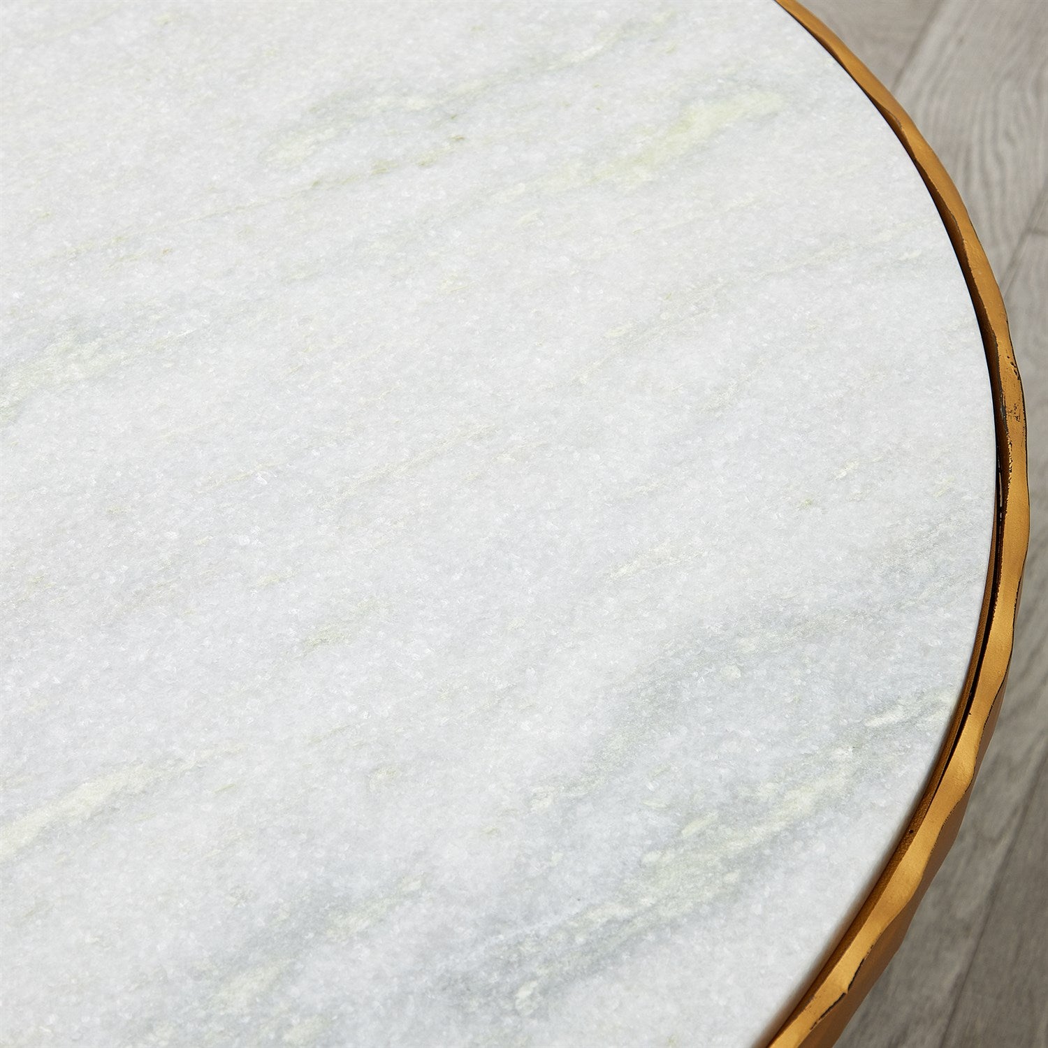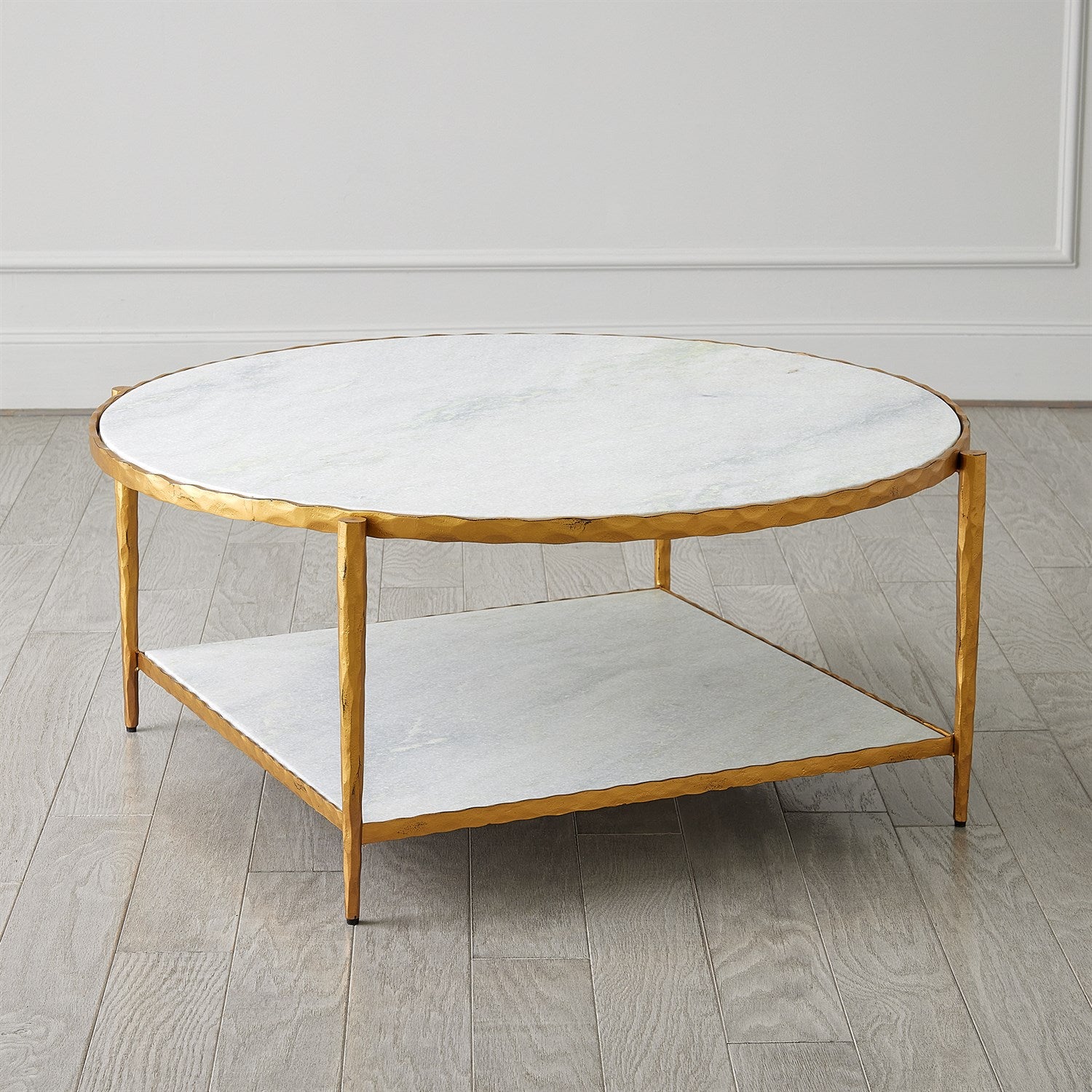White marble and modern, industrial iron come together in a display of strength and beauty. The Circle/Square Cocktail Table has a hammered texture with a hand-painted luxe gold finish. Table top is made of white marble that is a natural material made from the earth. Each table top will have variations in color and veining depending on the block it was cut from. The unique and natural quality of the marble should be celebrated and not considered a defect.