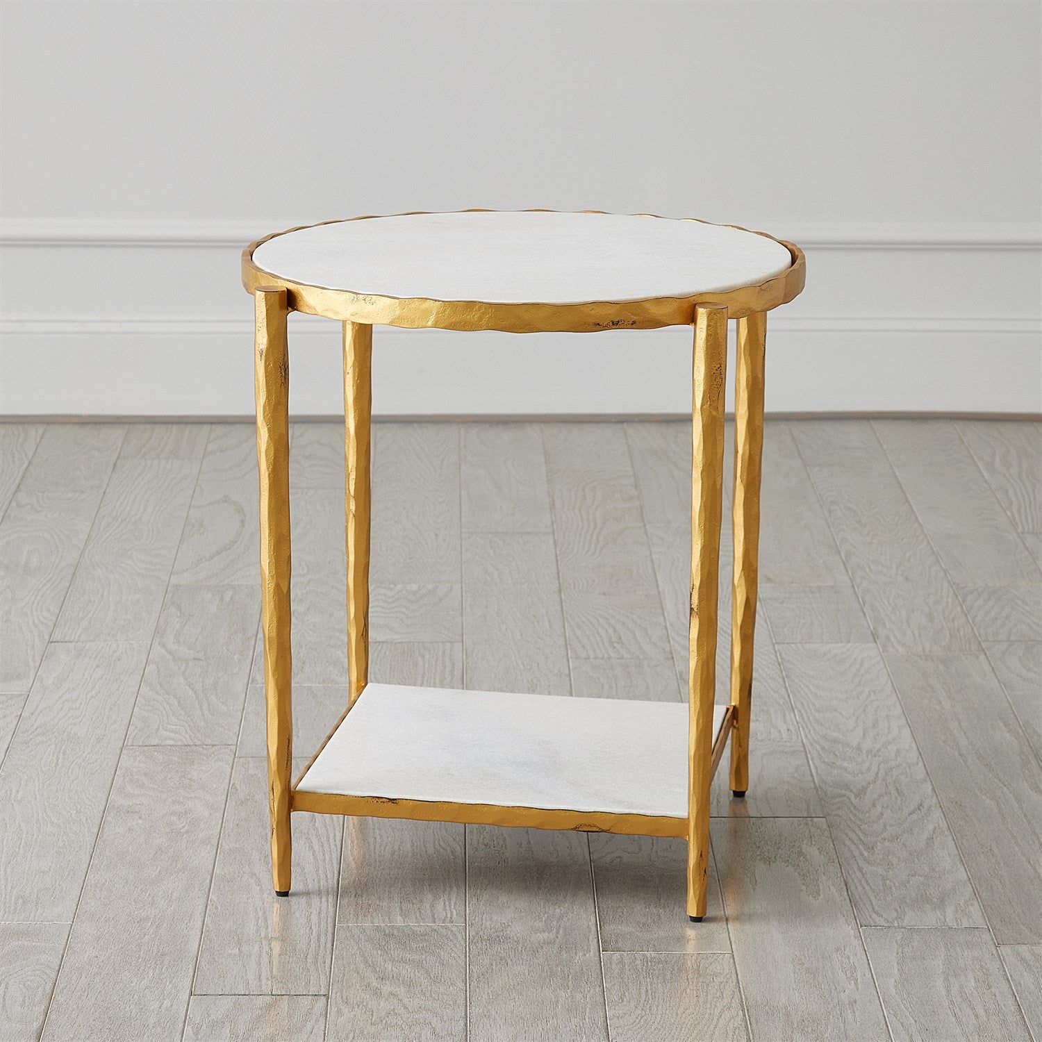 White marble and modern, industrial iron come together in a display of strength and beauty. The Circle/Square Side Table has a hammered texture with a hand-painted luxe gold finish. Table top is made of white marble that is a natural material made from the earth. Each table top will have variations in color and veining depending on the block it was cut from. The unique and natural quality of the marble should be celebrated and not considered a defect.