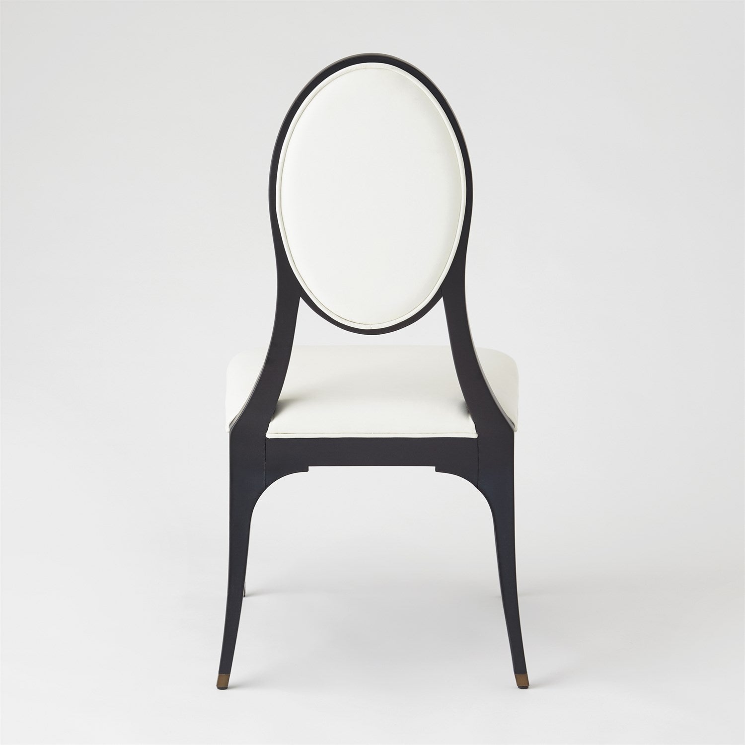 The Harlow Chair features a Hollywood Deco silhouette with top grain white leather and matte black lacquer finish. Also available in muslin.