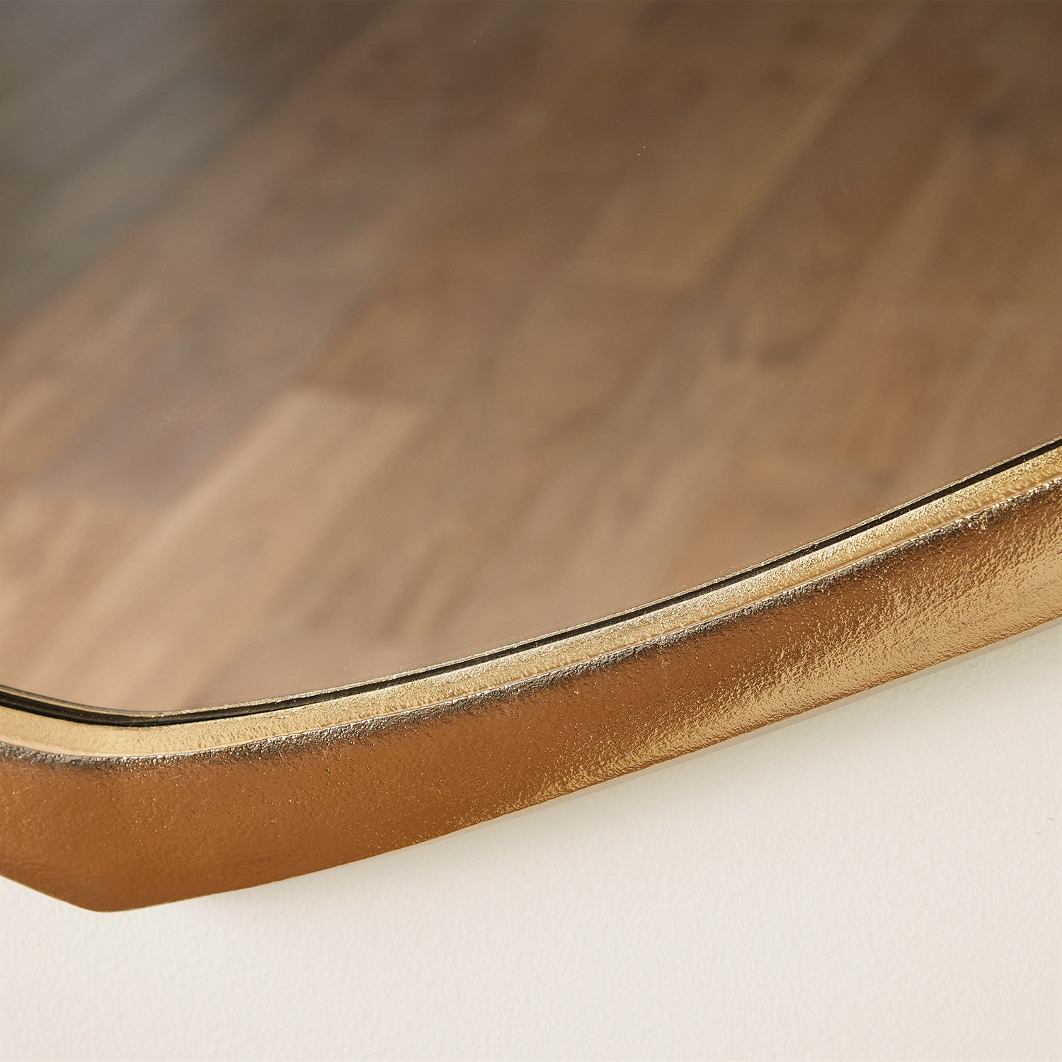 Add a bold touch to your decor with the Hexagon Mirror. Crafted from aluminum and featuring a textured gold finish, this eye-catching piece is perfect for making a statement on any wall.
