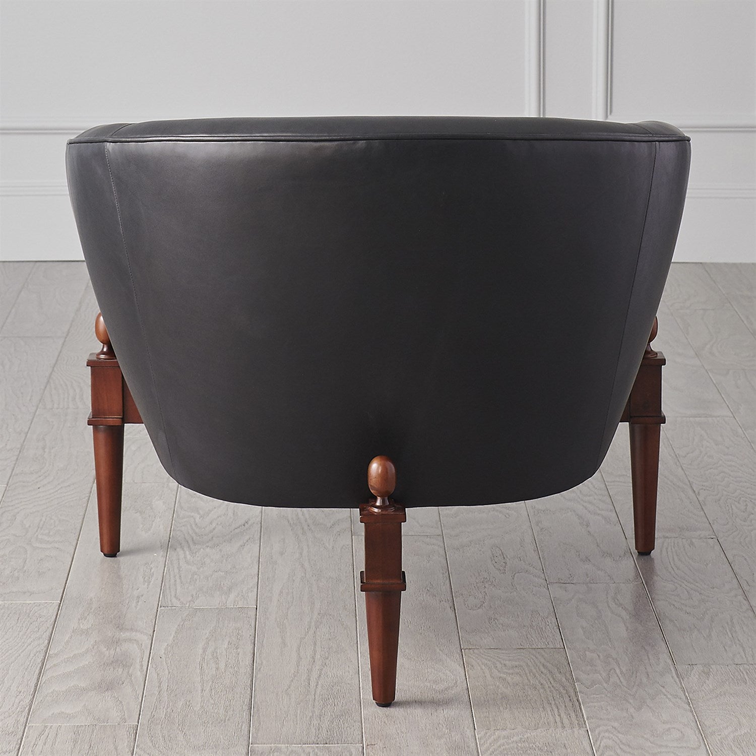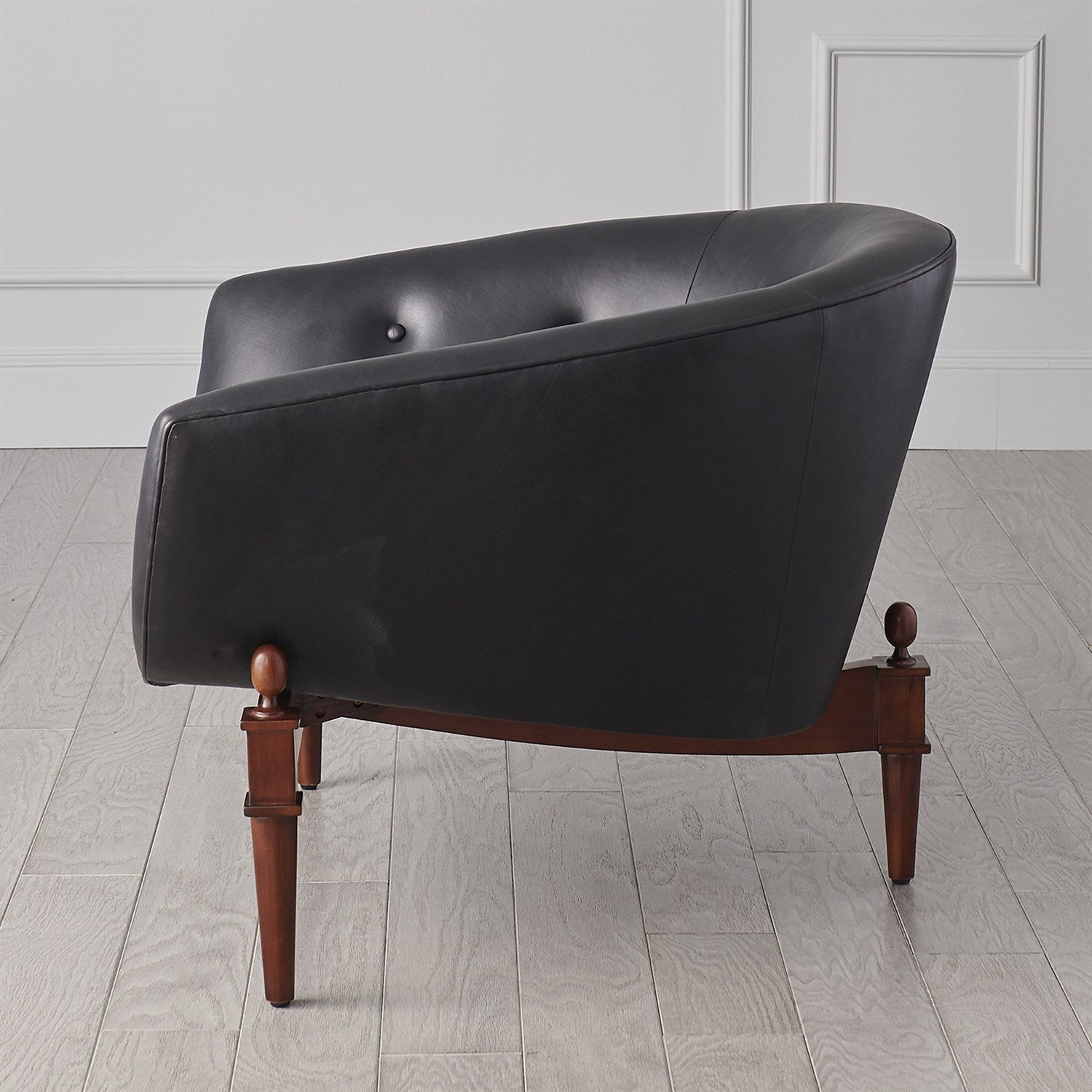 Reminiscent of the glamorous 1960's, the Global Views Mimi Chair marries modern design, exceptional craftsmanship, and very livable comfort. The barrel seat is covered in top grain marble leather, perched at a perfect pitch atop a three legged walnut-finished bracket base with finials. The Mimi Chair is stunning from every angle and begs to float in a room - offering changing silhouettes of surprising balance and proportion with every view. Classic, current, and timeless, the Mimi Chair harmonizes beautifully within the broad spectrum of high design.
