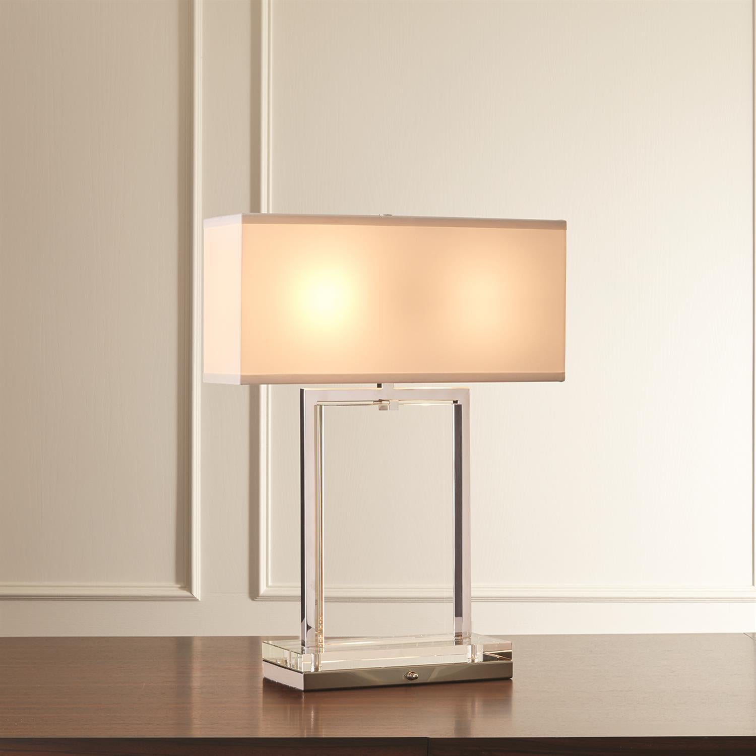 The simple beauty of Global Views' Crystal Slab Lamp in a mini version is sure to bring a quiet elegance to any room. Featuring a sleek crystal base and rectangular hardback shade covered in ivory silk, the lamp holds two 40watt "A" lamp bulbs and has an easy-to-access switch at the base.