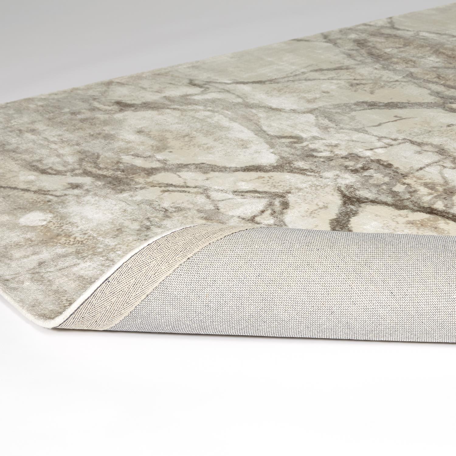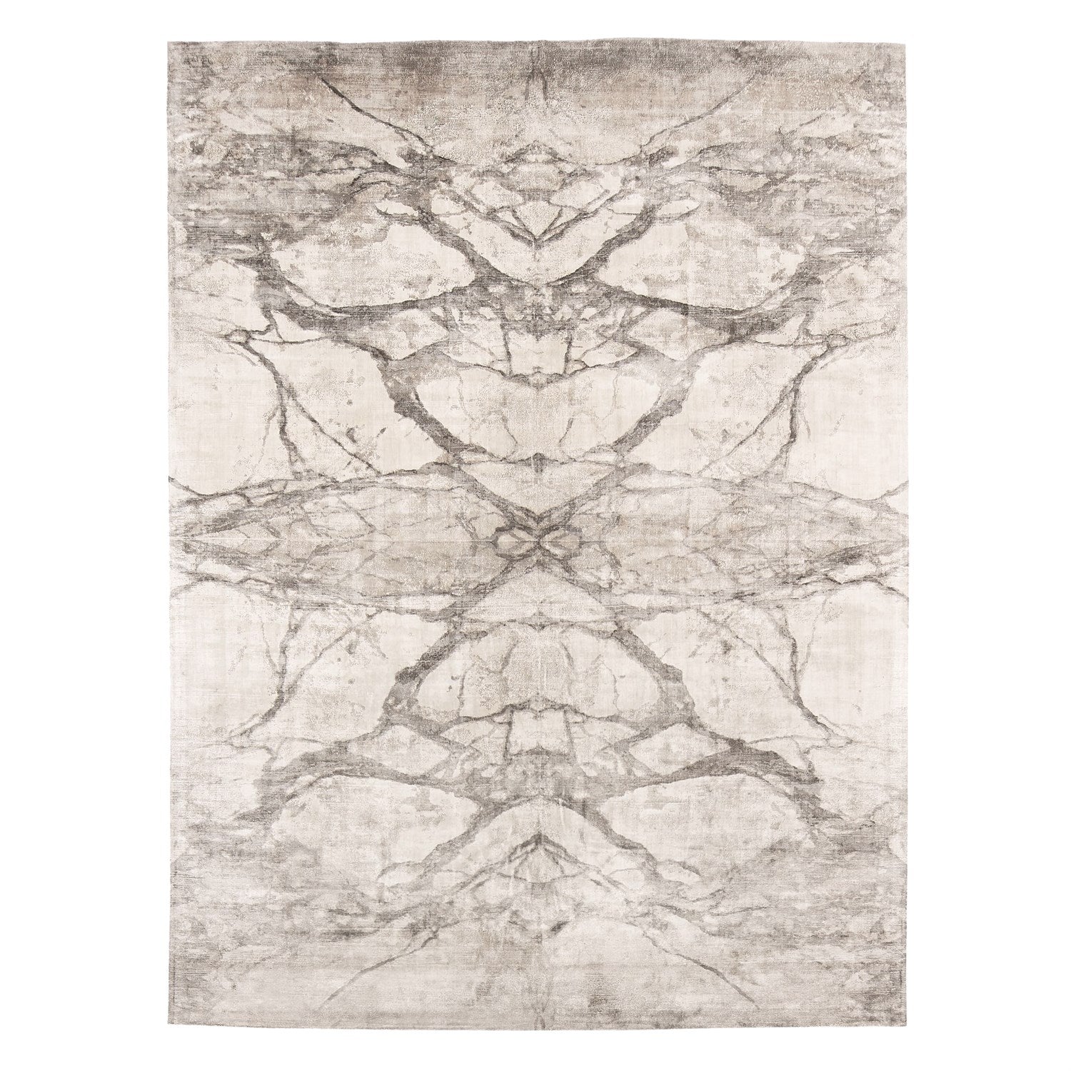 Screen printed bamboo silk rug with motif of mirror matched marble. Marbled rug print is cut at 90 degree angle and then formed together to create a full sheet, make these wonderful marble mirrored appearance joints. If the four quadrants are put together to form a rectangle, the results are stunning with the continuation of the pattern appearing in the center like a Rorschach test pattern. Very unique and 'now' in design and feel.