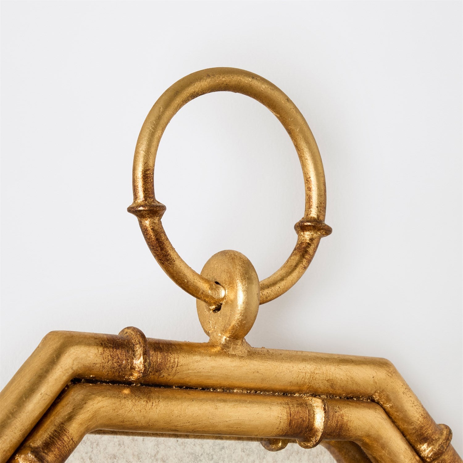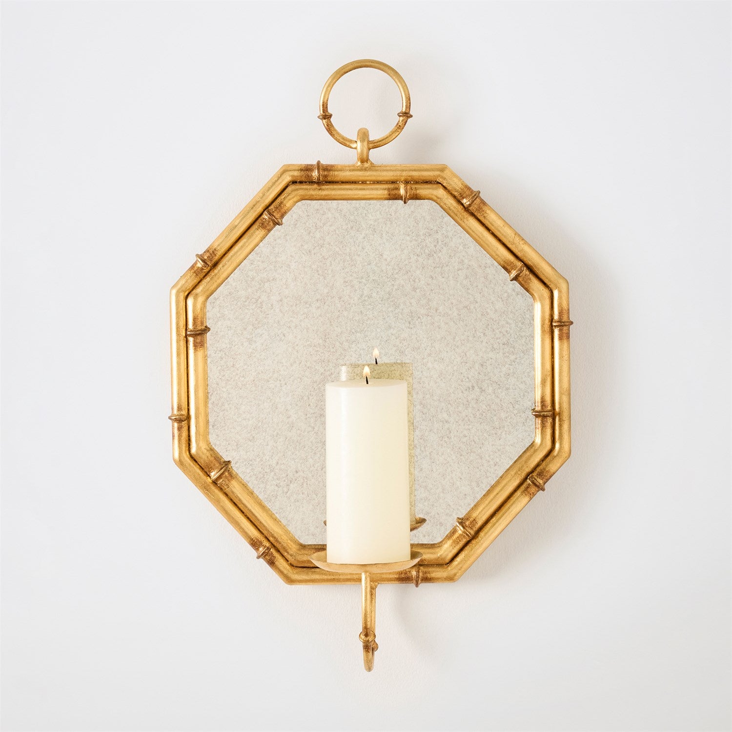 Crafted with care and precision, the Octagonal Bamboo Mirror and candle holder features a unique fusion of bamboo-inspired detailing and elegant iron accents. Its octagonal shape invites admiration and the gentle glow from a candle adds a sense of intimacy and serenity. Finished in gold leaf with an antiqued mirror background. Candle is not included.