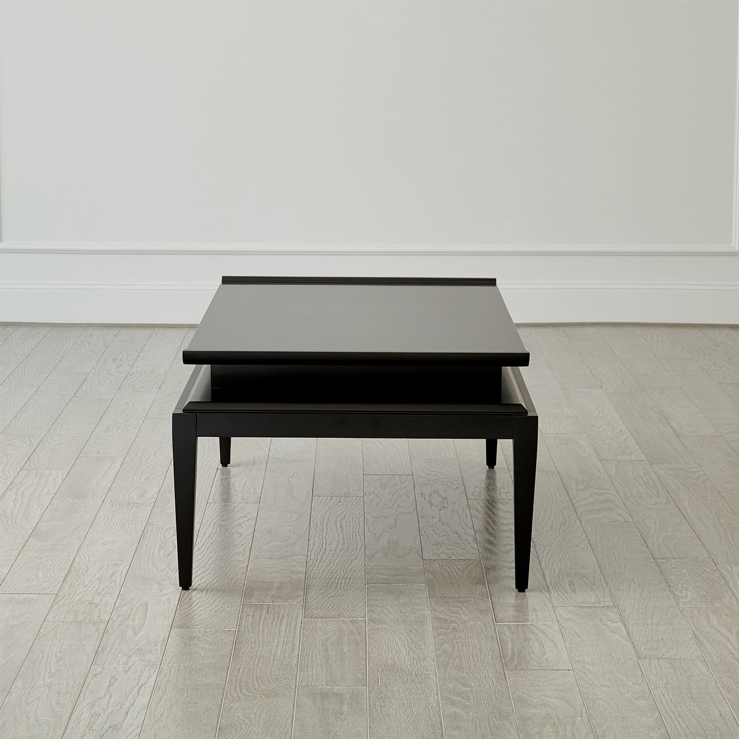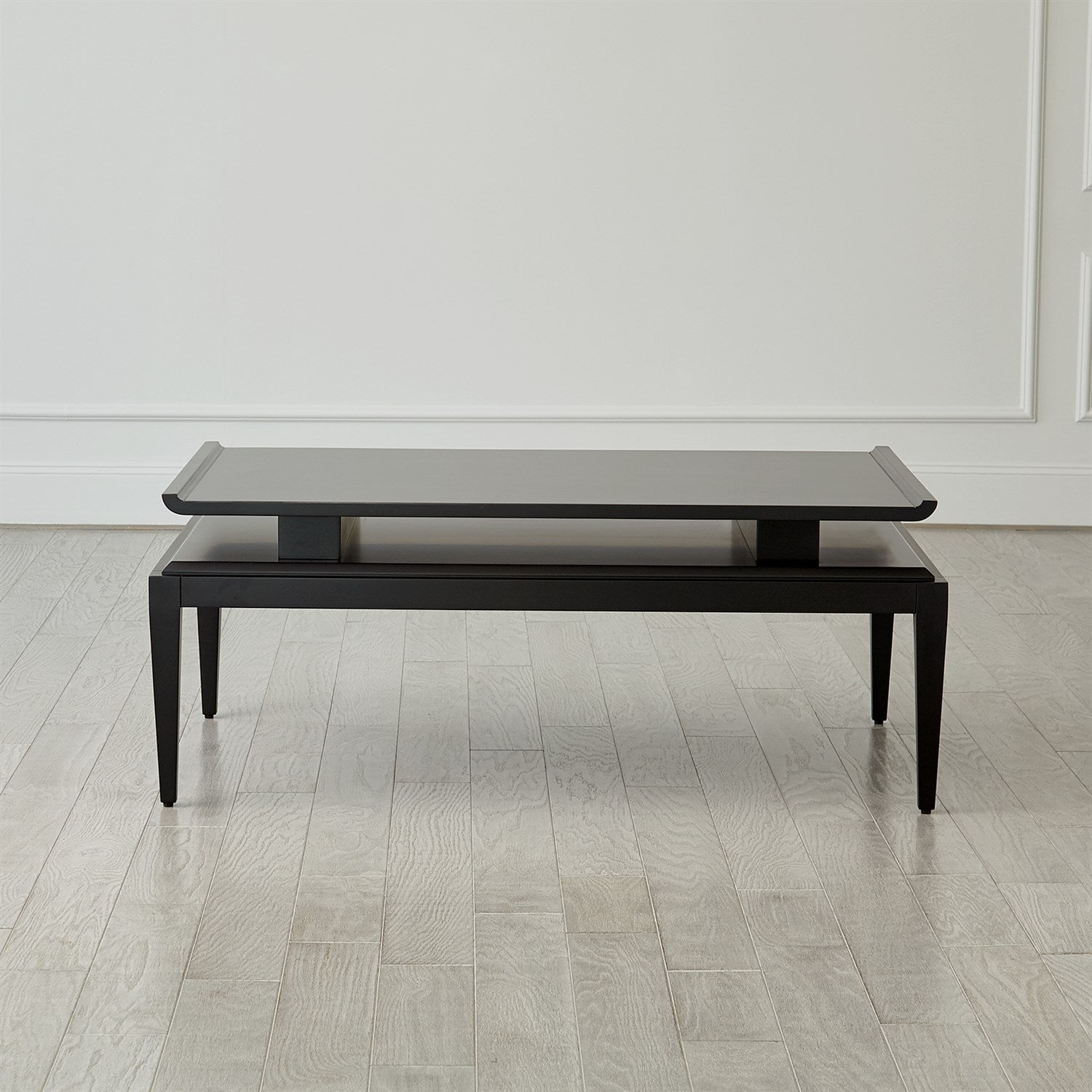 Chinoiserie-inspired silhouette with a lacquered piano finish. Console tables available in deep red and black finishes. Coffee and side tables available in black finish.