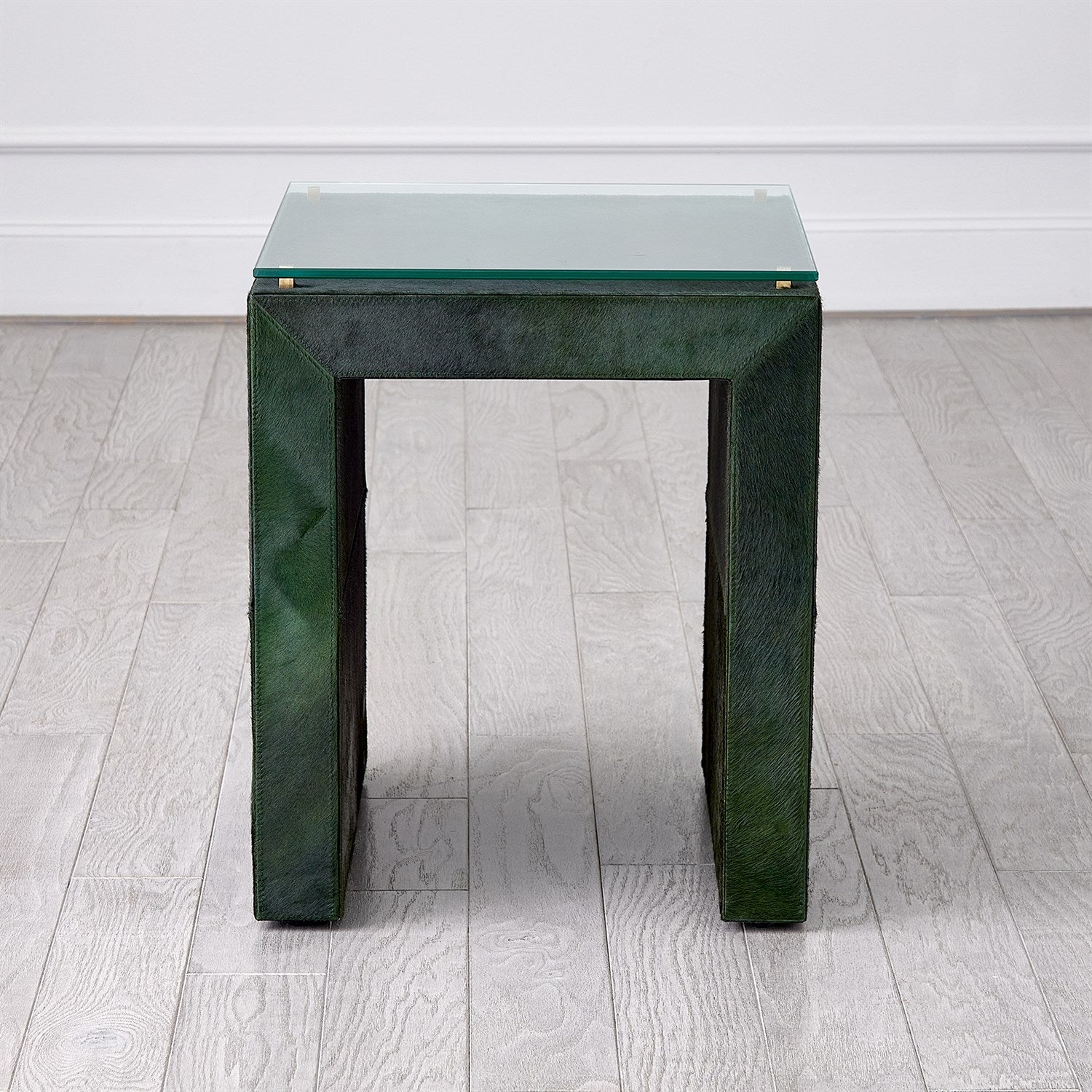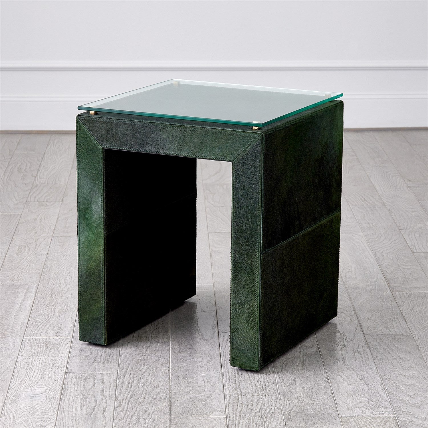 The Posh Side Table is luxuriously wrapped in green hair-on-hide leather blending practicality with sophistication in your living space. The side table features antiqued brass-finished accents and a tempered glass surface.