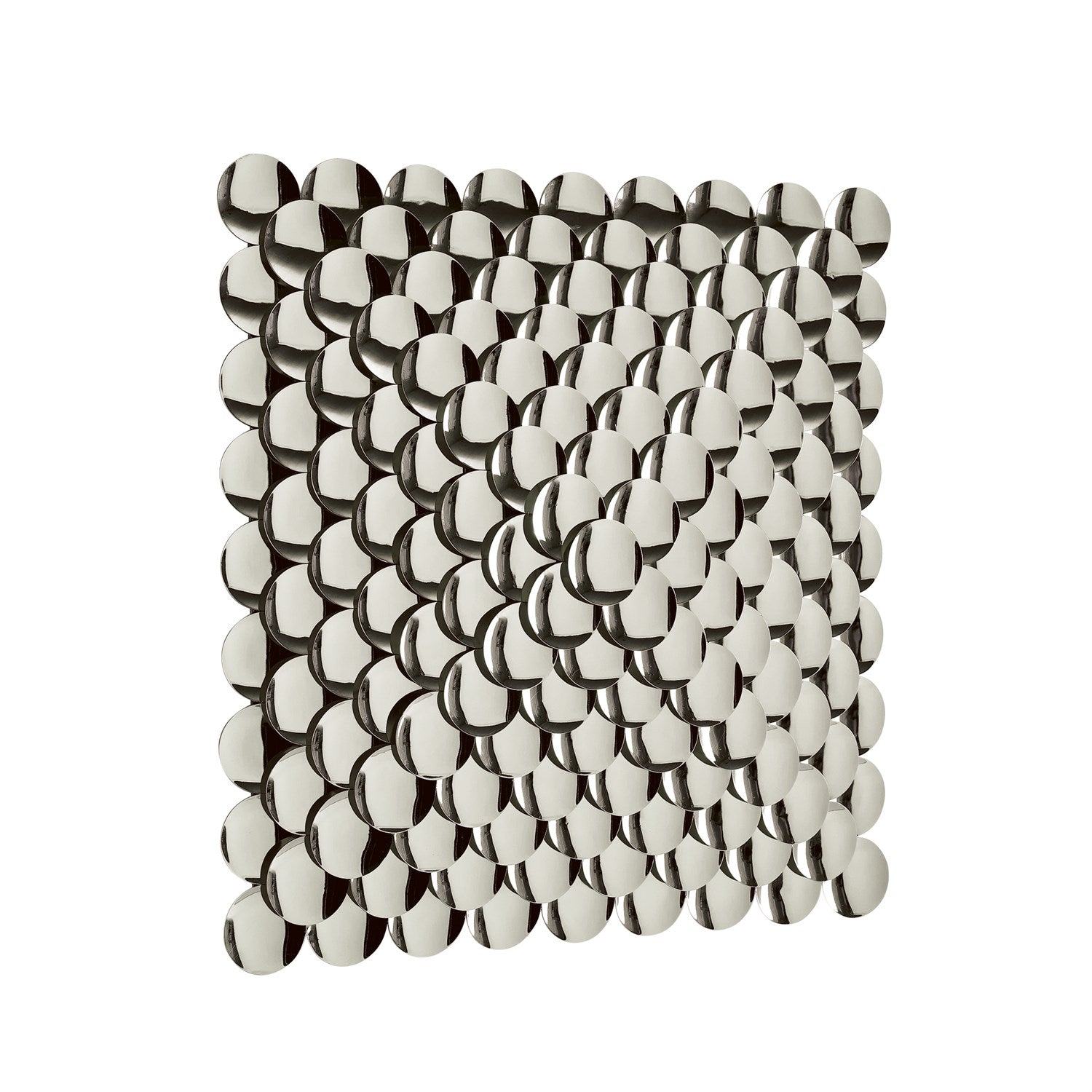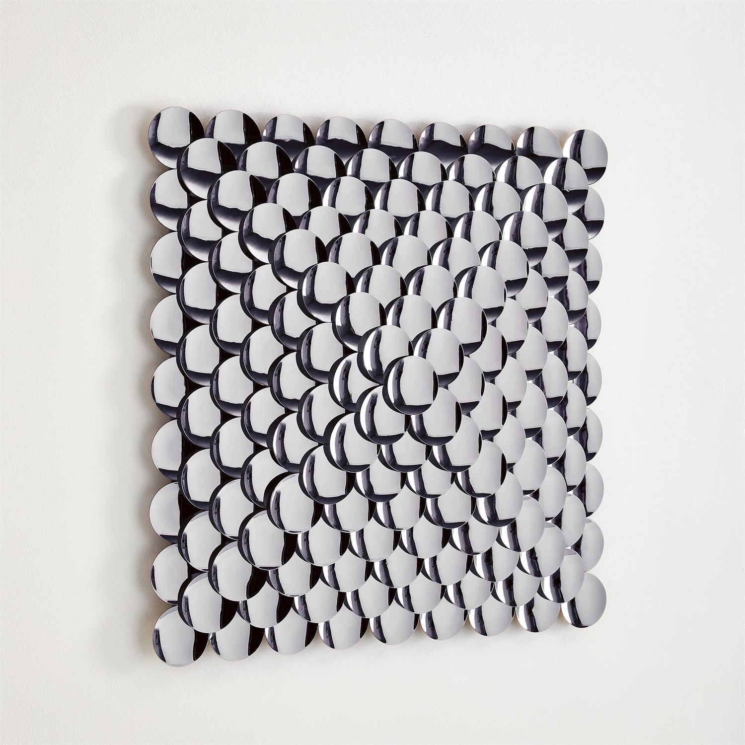 The Pyramid Wall Decor is skillfully crafted from stainless steel and adorned with a lustrous nickel finish. Artisans meticulously hand-forge each circular piece, resulting in a masterpiece of art that adds a touch of elegance to your space.