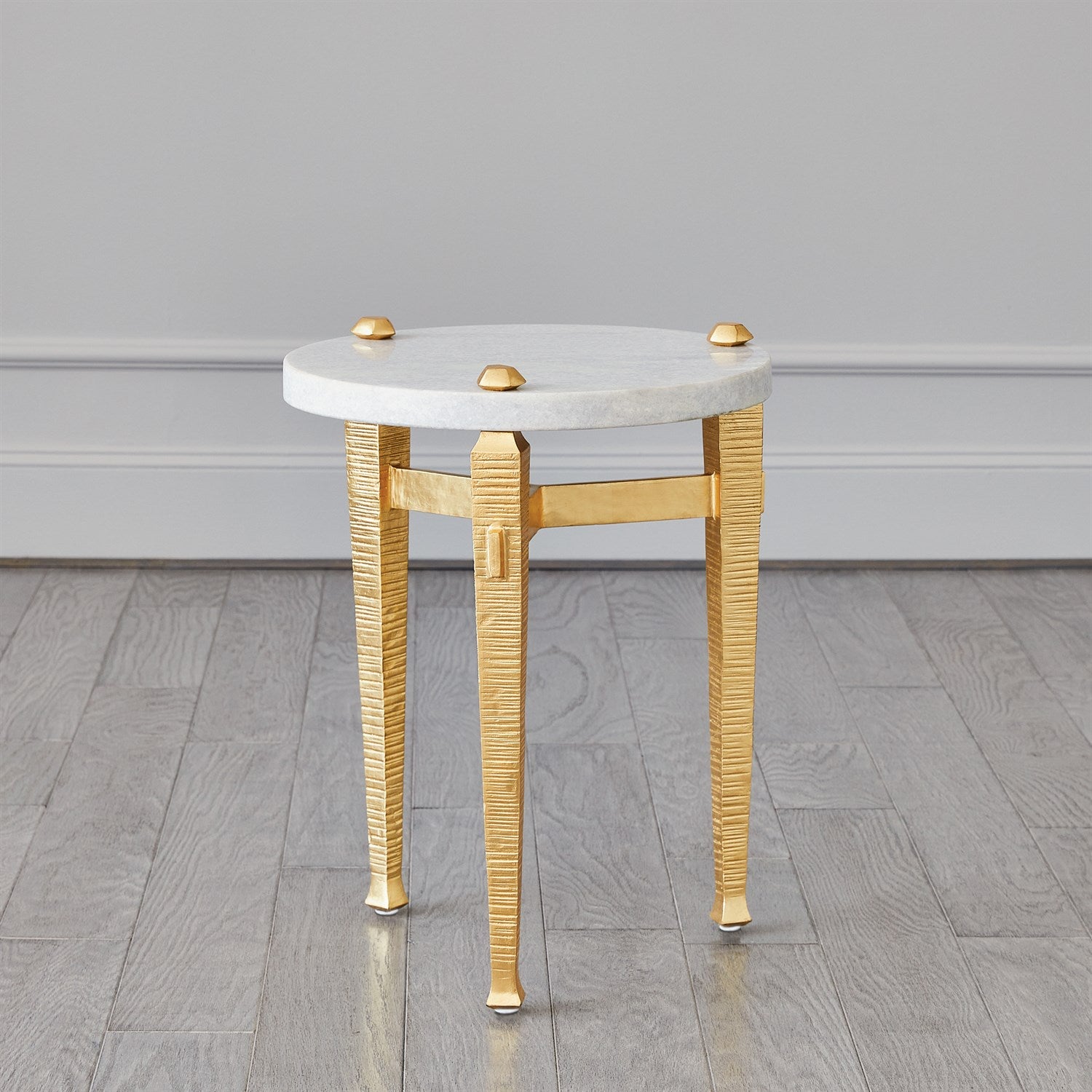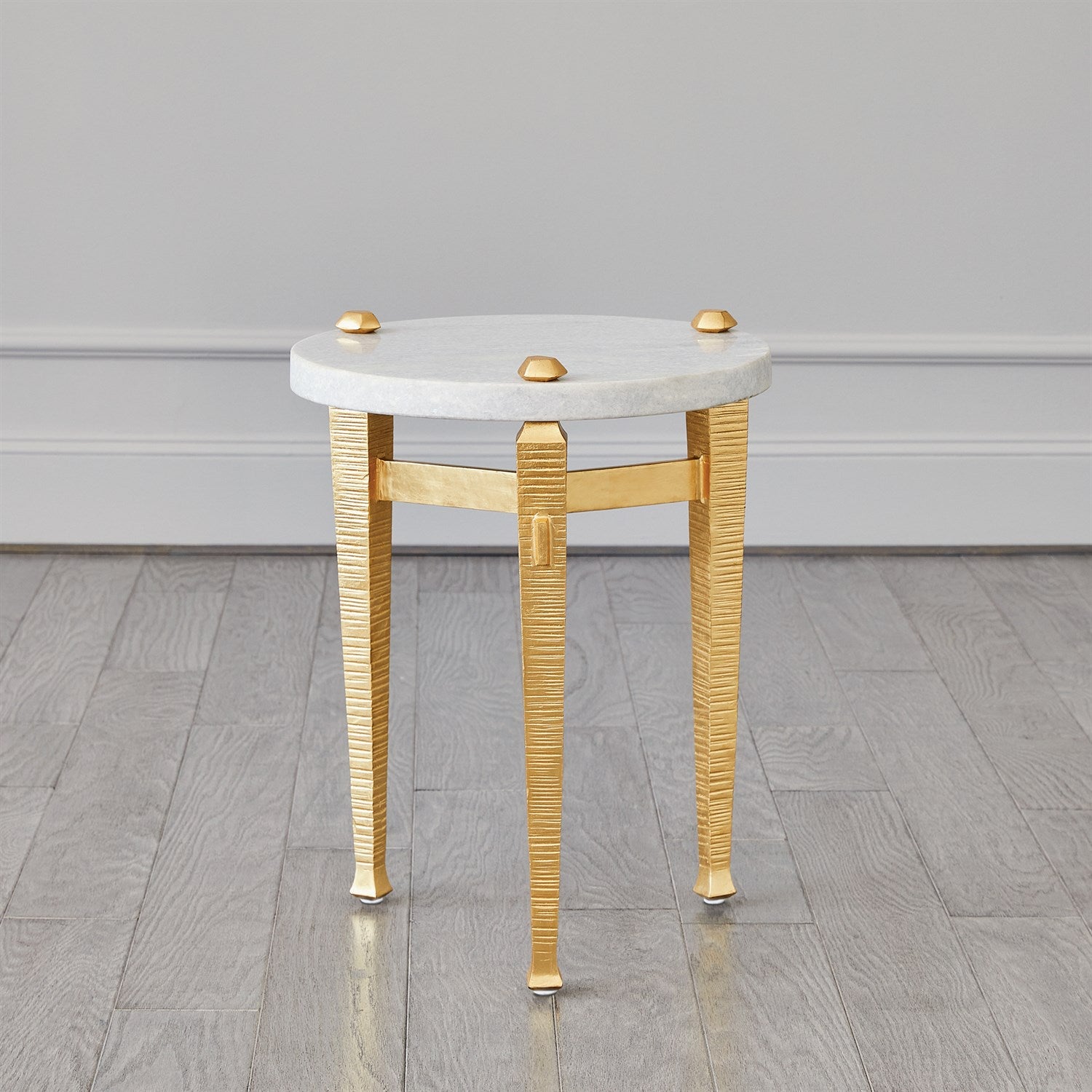 The Roman collection by Roger Thomas draws inspiration from two notable sources. The silhouette of the leg was inspired by pieces crafted by Thomas Chippendale. The horizontal chiseled texture pays homage to a desk that was designed by David Roentgen. The bases are made of iron and are available in a nickel-plated finish and a gold leaf finish. The gold leaf versions pair with white marble tops and the nickel-plated versions feature flamed black marble.