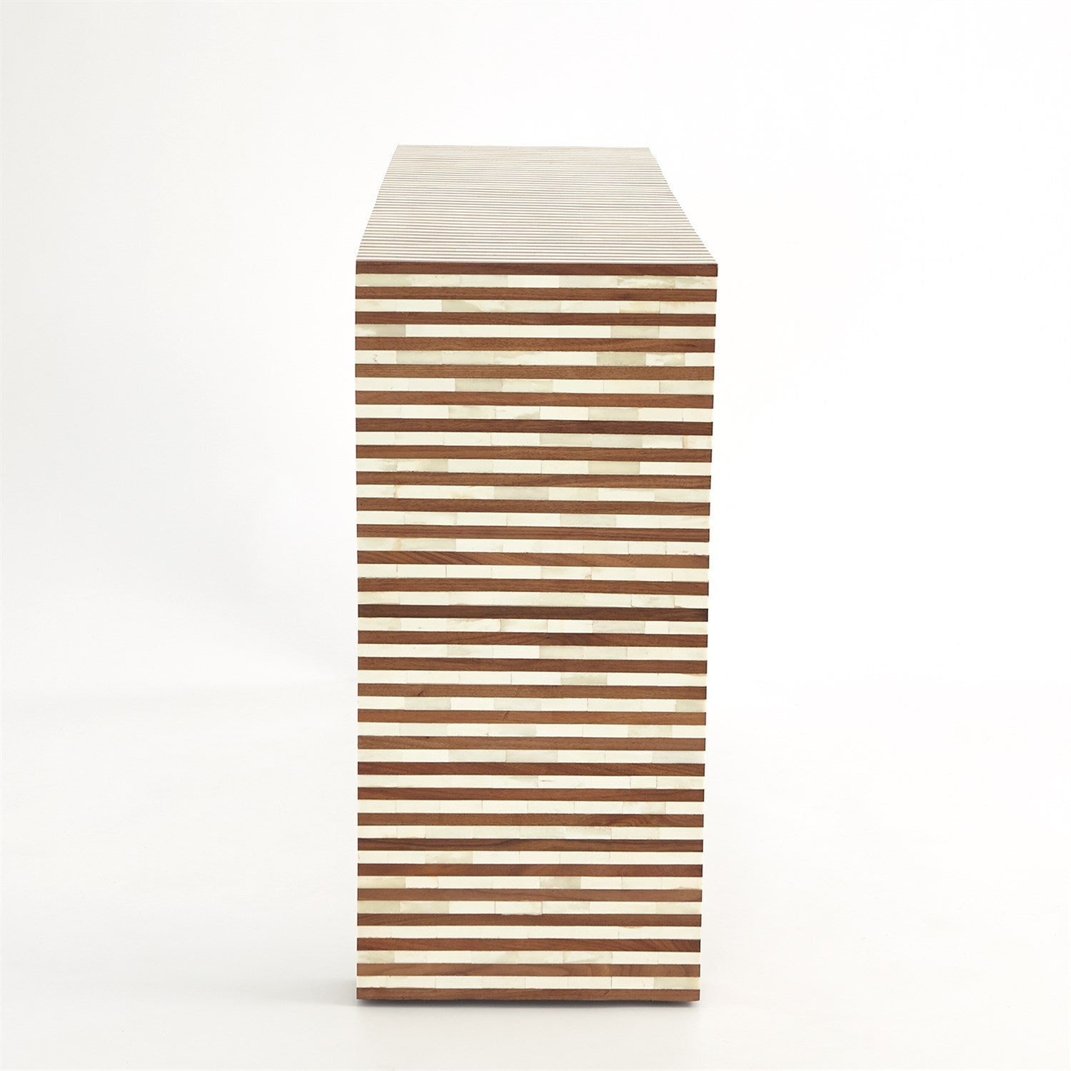 The Sienna Collection pattern is made by alternating walnut wood, bone, and mango wood. Natural lacquer finish.