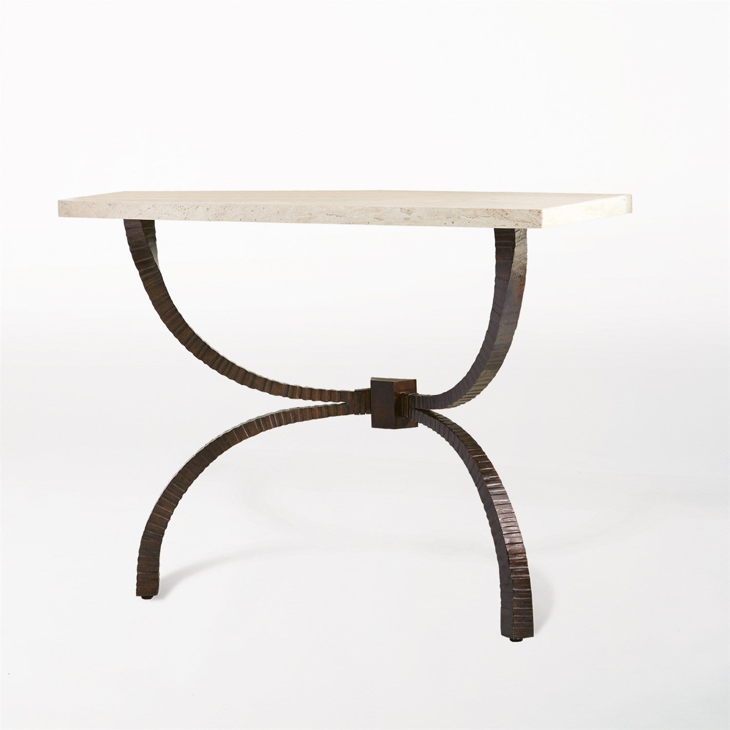 A handsome console interpretation of the popular tripod Teton table, the Teton Console mounts to the wall with bracket at the back of the iron base. The solid forged iron base is finished in bronze and is paired with a travertine top. Also available in gold leaf with antiquing paired with a Durango marble top.
