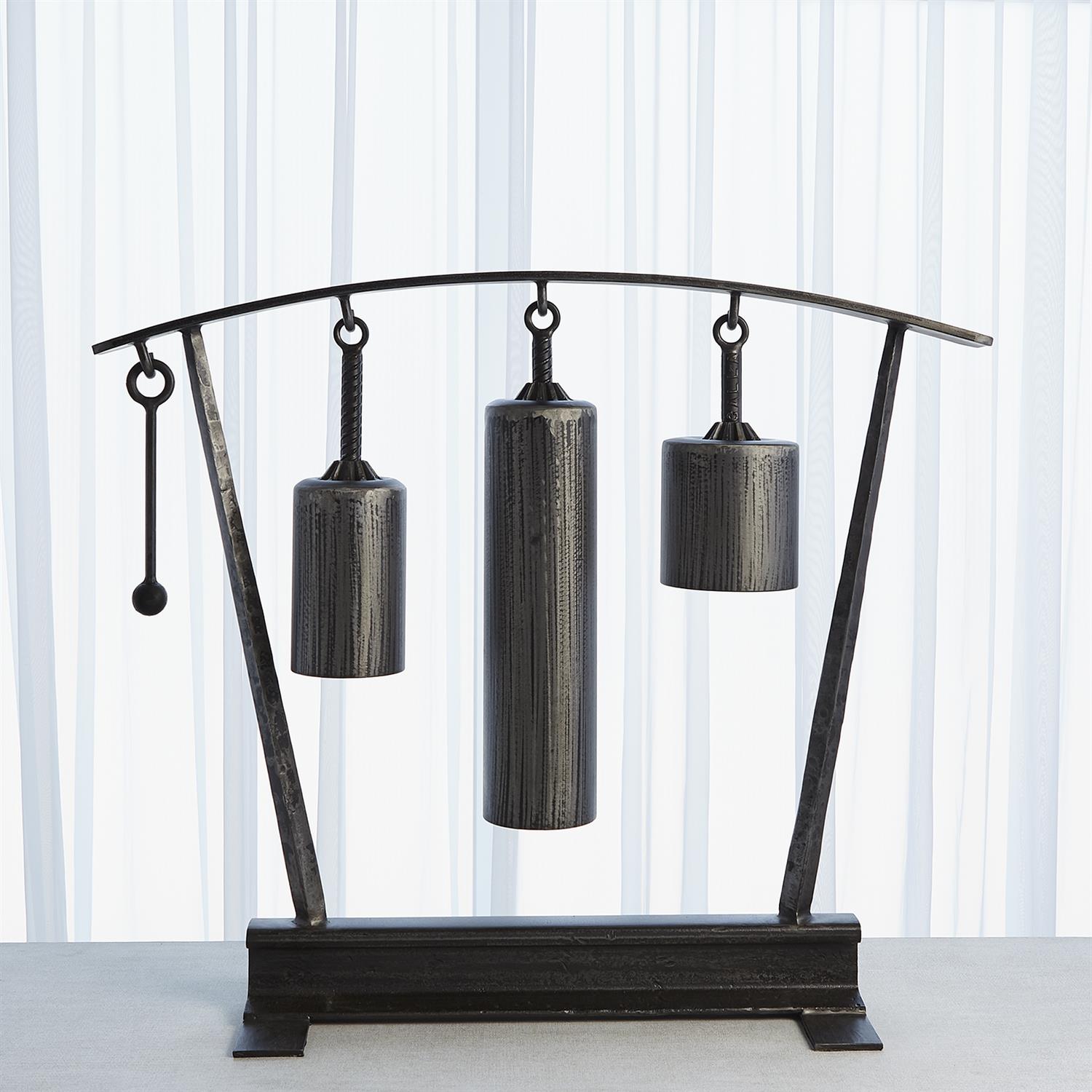 Ernst Gruler's original Sound Sculptures were made from repurposed scrap steel and pressure canisters, with a liberal sprinkling of industrial chic, and the technical and aesthetic attention?to detail that informs all of Ernst's work. The bells are meant to be rung, and in many cases other parts of the sculptures also resonate when struck. This is why he calls them Sound Sculptures: they invite exploration and interaction, along with the contemplation of the origin and previous functions of the various scrap components of the sculptures.?Studio A Home has reproduced Ernst's original Sound Sculptures from iron. They exactly reflect the component parts of his originals. Available in three styles.
